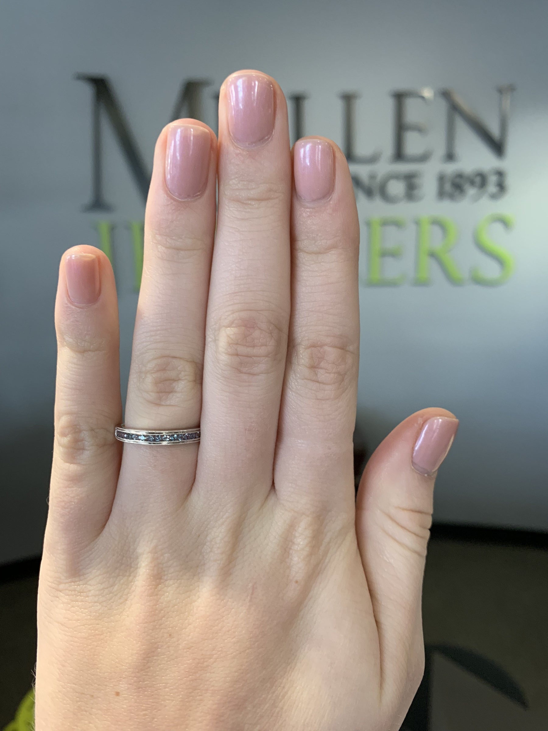 10k white gold blue topaz channel set birthstone ring. The perfect December birthstone ring or mothers ring, this 10 karat white gold band has channel set round blue topaz going half way around the ring. Finger Size 5.5.