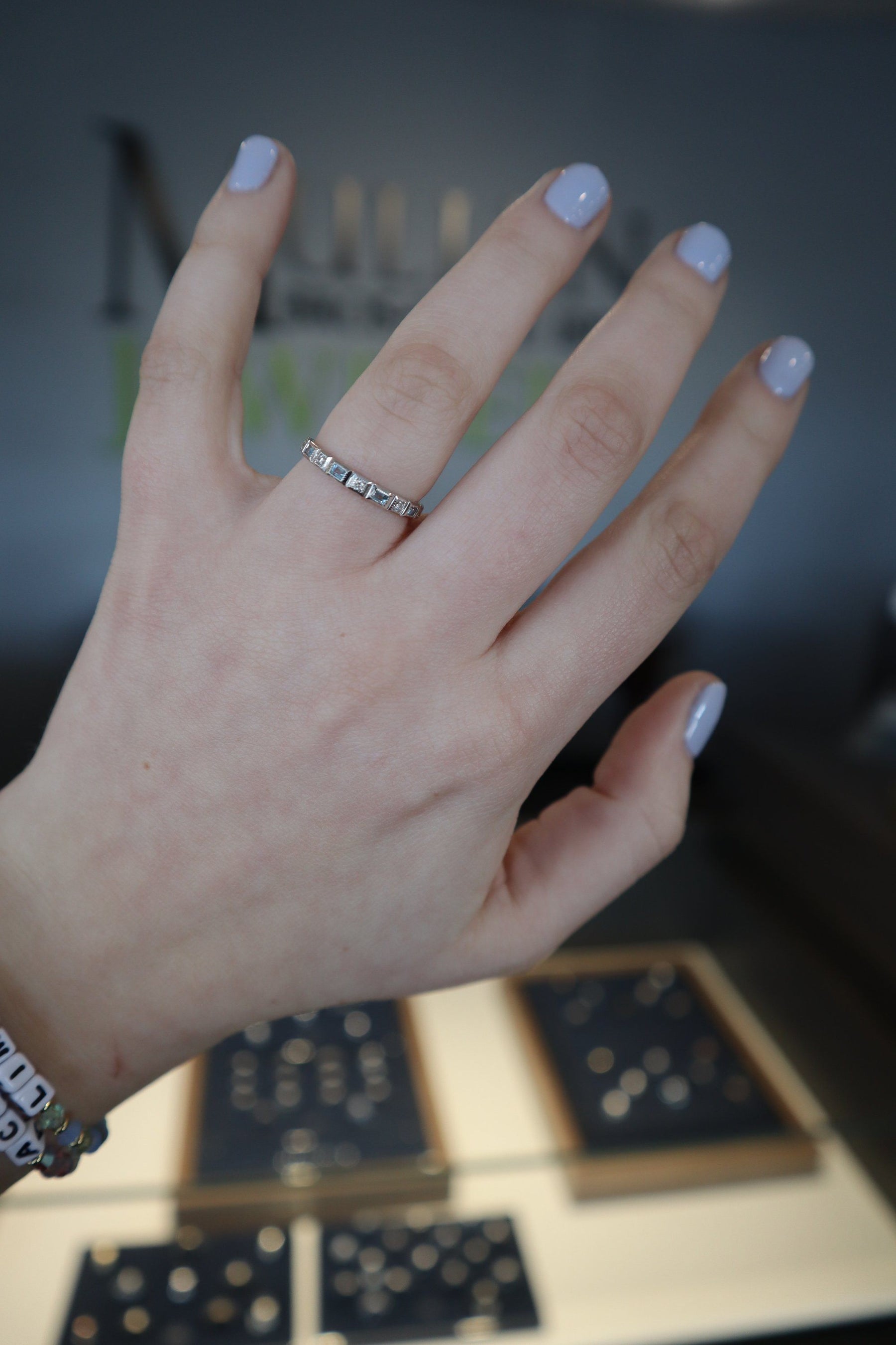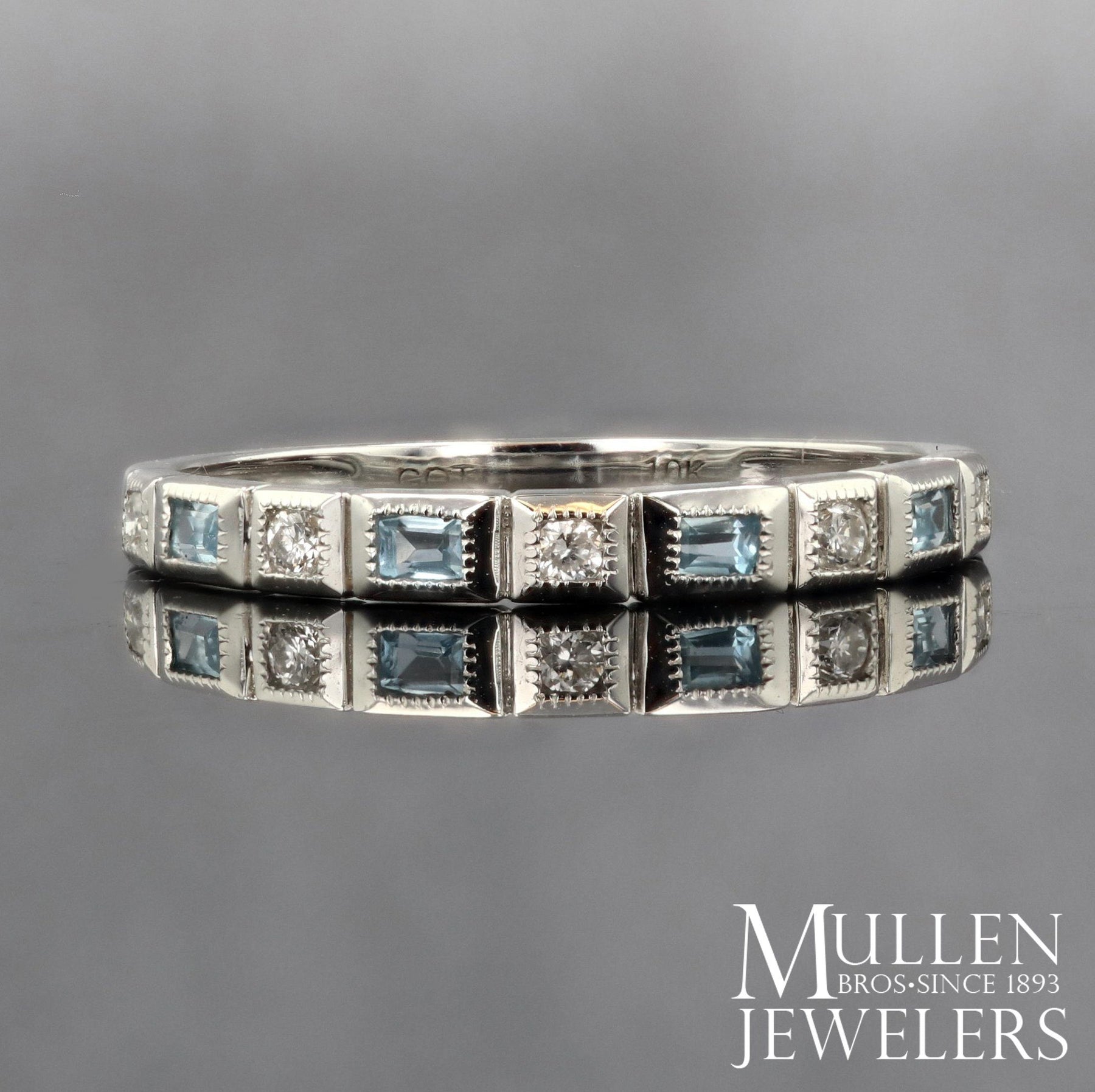 10k white gold diamond and emerald cut blue topaz birthstone ring. The perfect December birthstone ring or mothers ring, this 10 karat white gold band has emerald cut blue topaz and diamonds alternating half way around the ring. All birthstone rings and mother's rings are available in all birthstones, although the April (diamond) version may cost more. Looks great worn alone, or as a stackable ring.