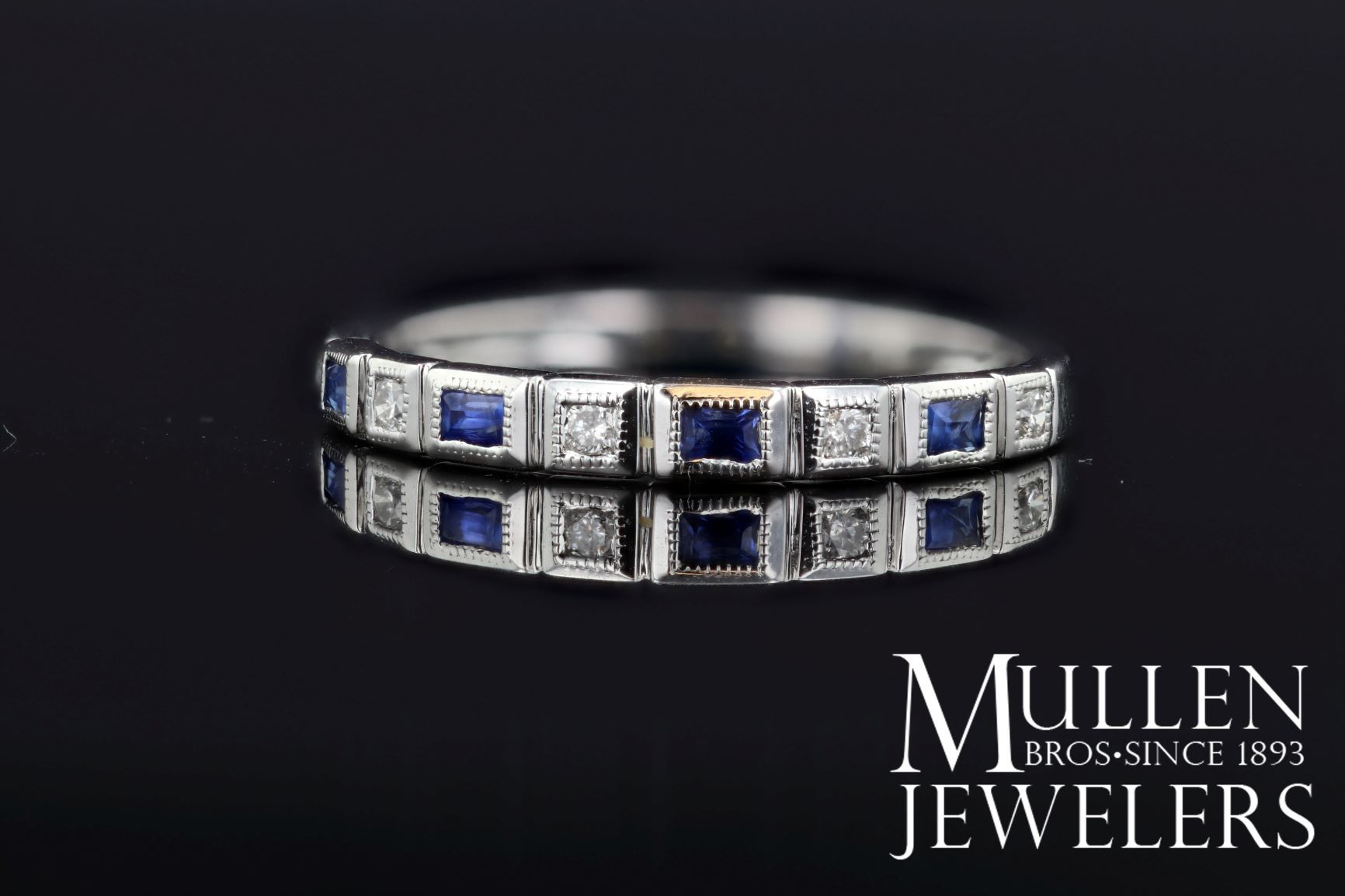 10k white gold diamond and emerald cut sapphire birthstone ring. The perfect September birthstone ring or mothers ring, this 10 karat white gold band has emerald cut sapphires and diamonds alternating half way around the ring. All birthstone rings and mother's rings are available in all birthstones, although the April (diamond) version may cost more. Looks great worn alone, or as a stackable ring.