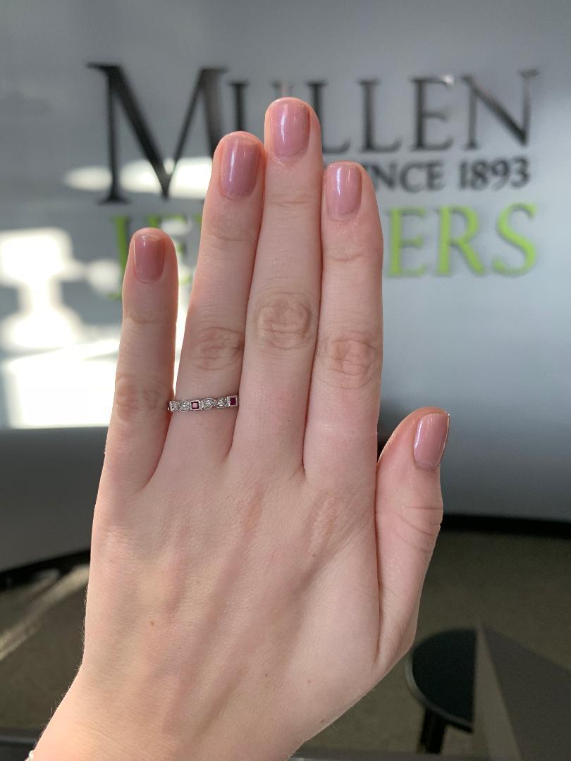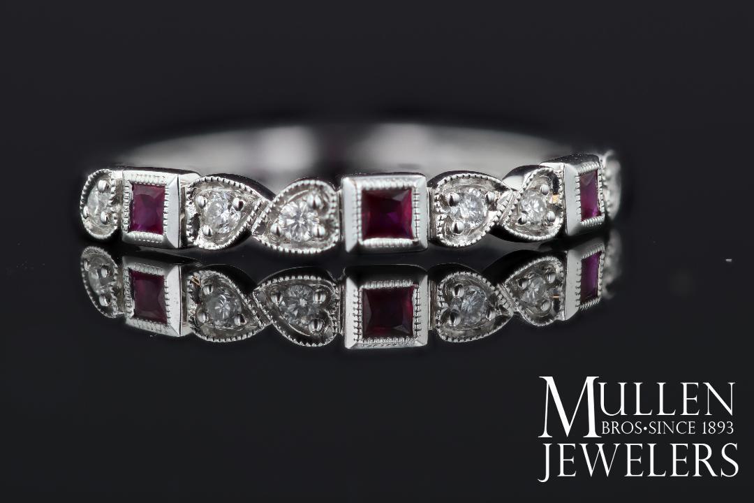 10k white gold diamond and square ruby birthstone ring. The perfect July birthstone ring or mothers ring, this 10 karat white gold band has square rubies and diamonds alternating half way around the ring. All birthstone rings and mother's rings are available in all birthstones, although the April (diamond) version may cost more. Looks great worn alone, or as a stackable ring.