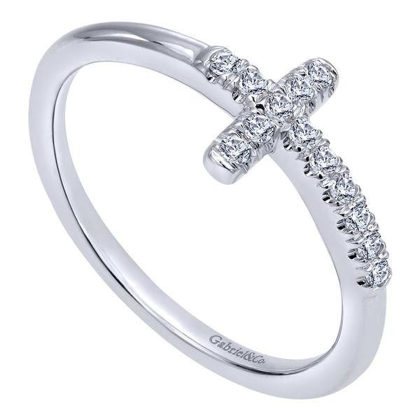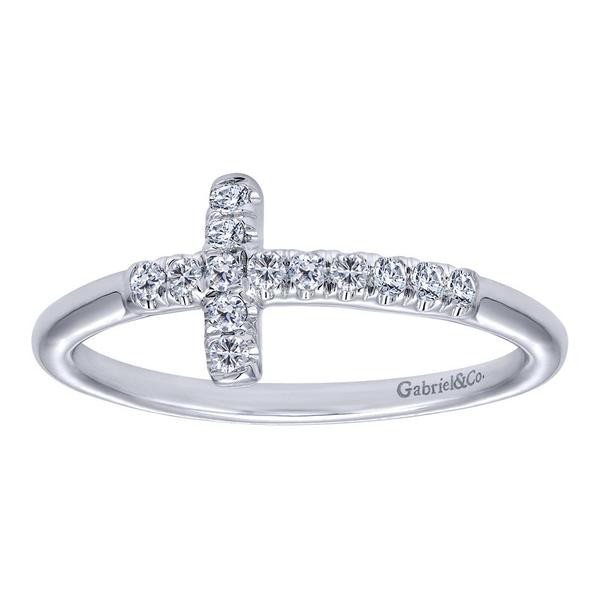 Diamond Sideways Cross Ring with 1/7cttw of Diamonds. This classic pave set diamond ring has a sideways cross design accented by .13cttw of round diamonds. Ring is 14K white gold and diamonds are I/J color and eye-clean SI3 clarity. Designed by Gabriel & Co., also available in yellow gold and rose gold.