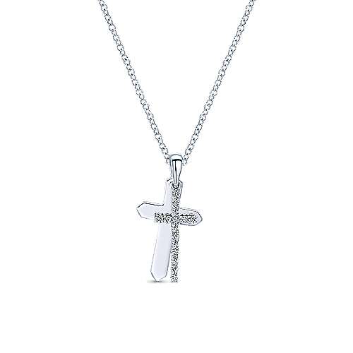 14K White Gold .08cttw Layered Diamond Cross Pendant. This fun diamond cross necklace features .08cttw of round diamonds pave set in a traditional cross design. Accented by a high polished 14K white gold backing cross. Comes with a 14k white gold 18 inch chain. This necklace is 14K white gold and diamonds are I/J color and eye-clean SI3 clarity. Designed by Gabriel & Co., also available in yellow gold and rose gold.