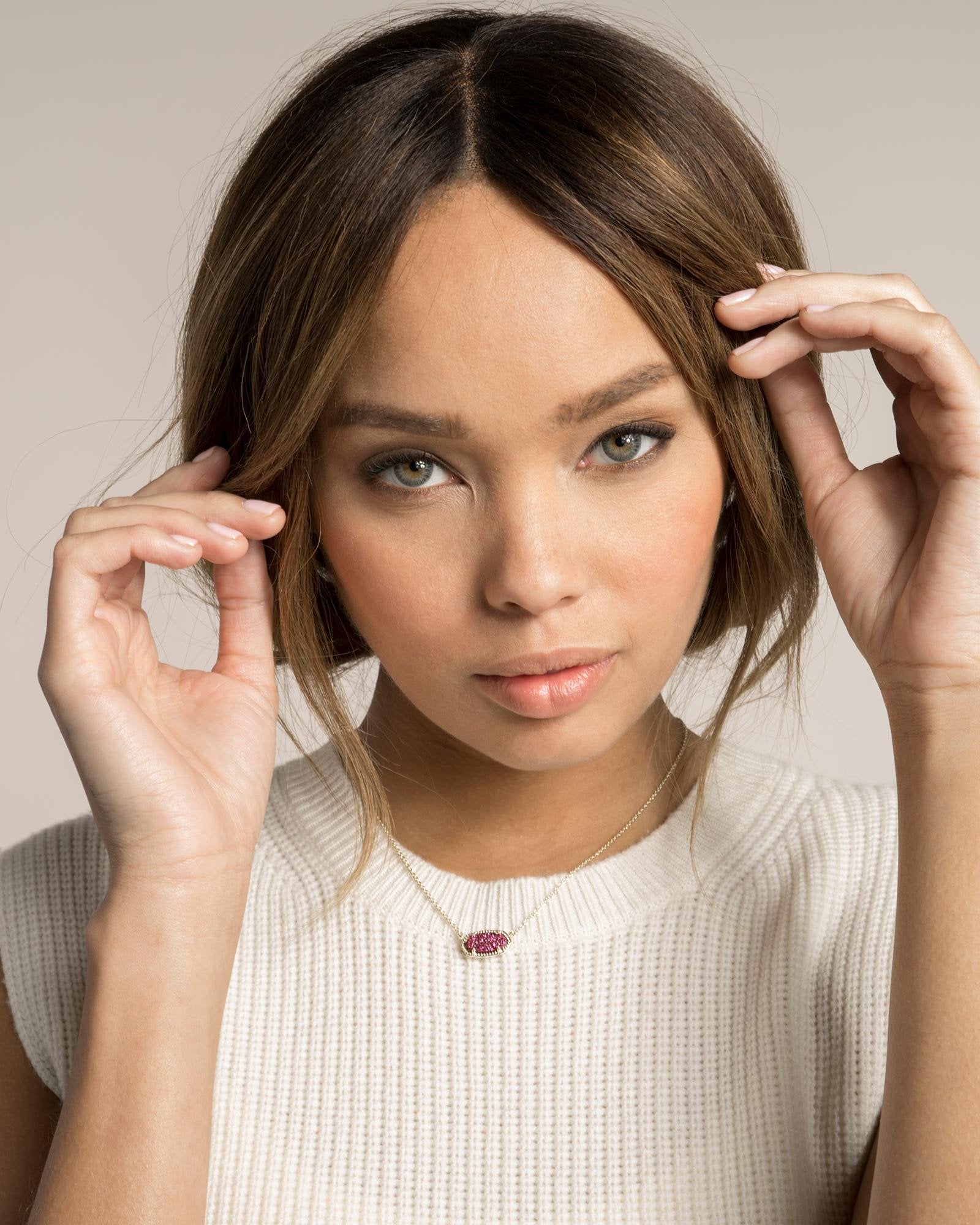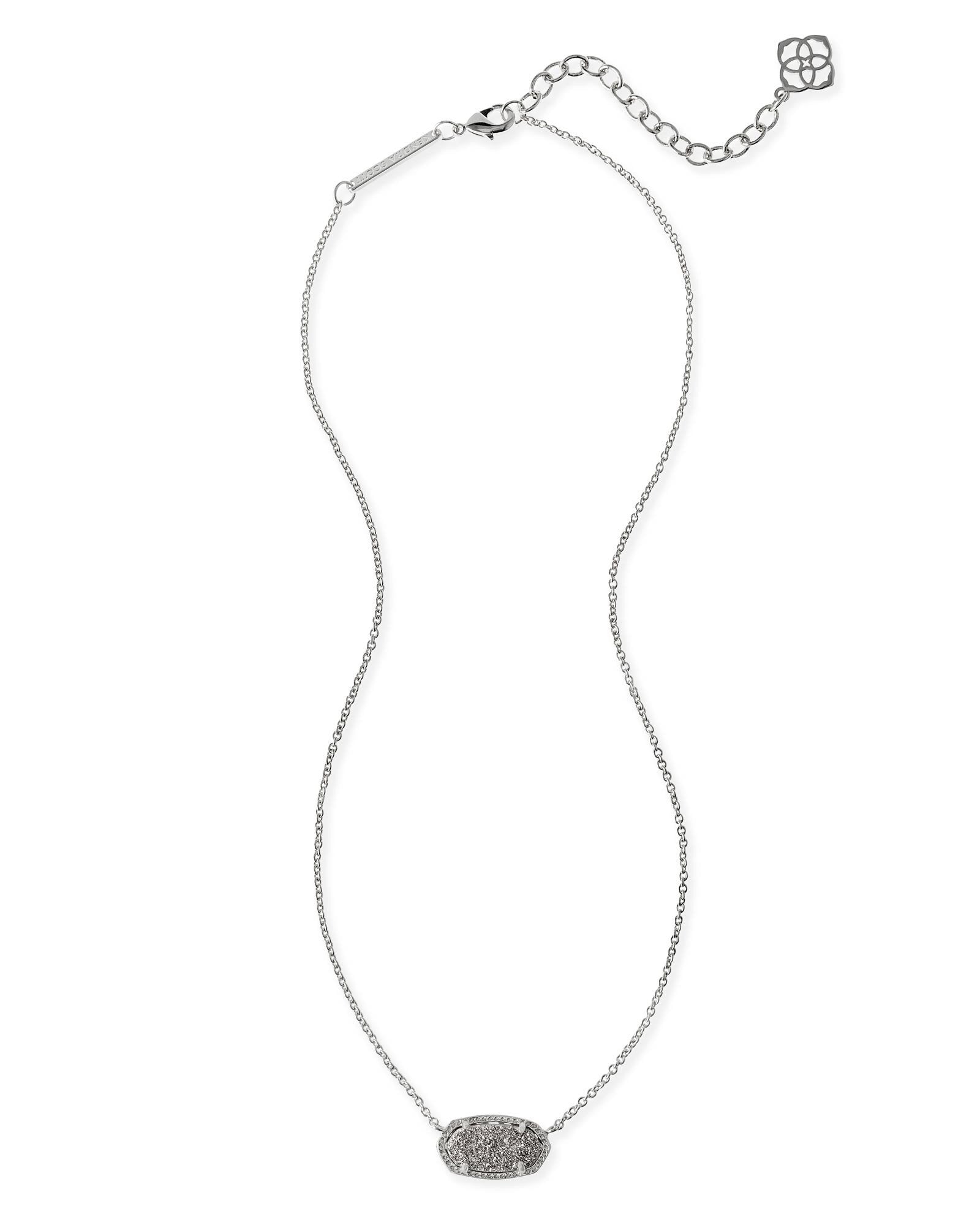 Kendra Scott Elisa Platinum Drusy Silver Necklace. This signature Kendra Scott oval silhouette turns heads with faceted platinum drusy accented by a delicate rhodium plated silver frame. Designed to add sparkle to every ensemble, comes attached to a 15 inch rhodium plated chain with adjustable 2 inch extender and lobster claw clasp.
