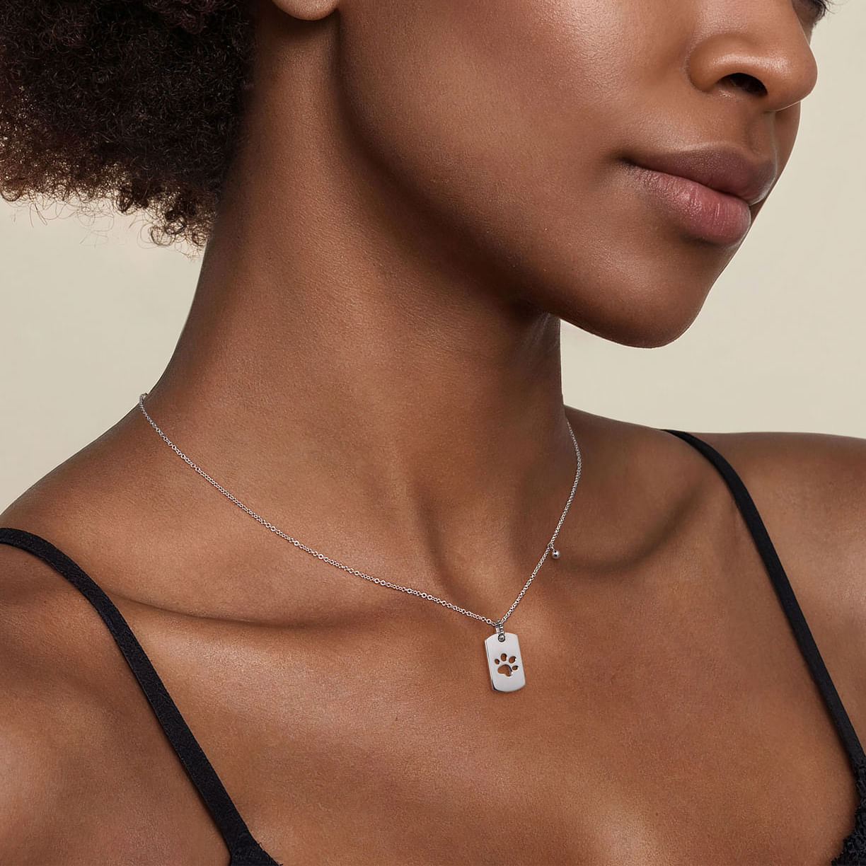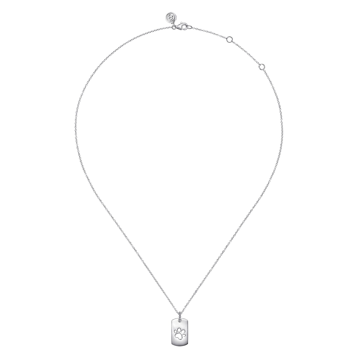 Sterling Silver Dog Tag Paw Print Necklace. This sterling silver necklace measures 17.5 inches in length and features a Bujukan dog tag paw print made of sterling silver. Designed by Gabriel & Co.