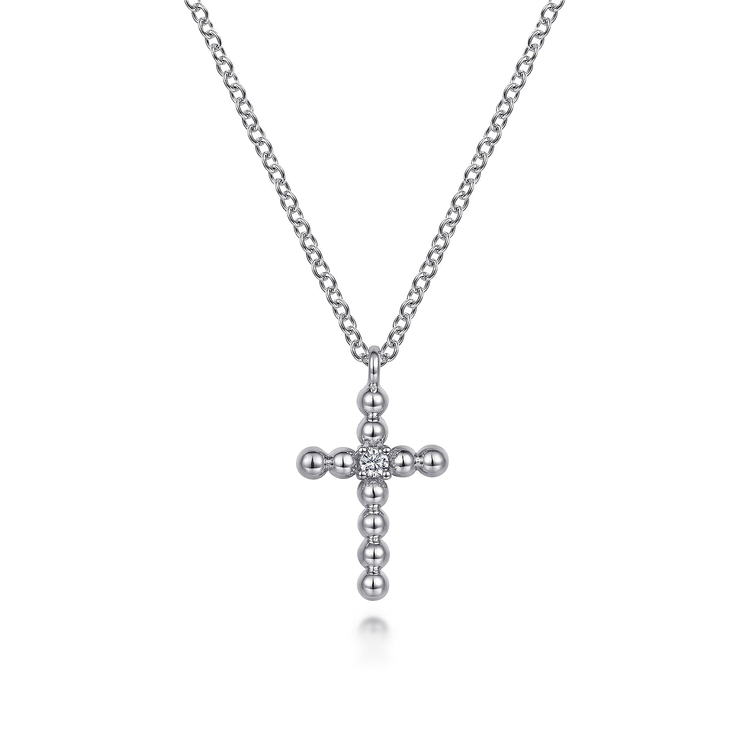 Sterling Silver Bujukan .03cttw Diamond Cross Necklace. This sterling silver necklace measures 17.5 inches in length and features a cross made of sterling silver accented with .03cttw diamonds. Designed by Gabriel & Co.