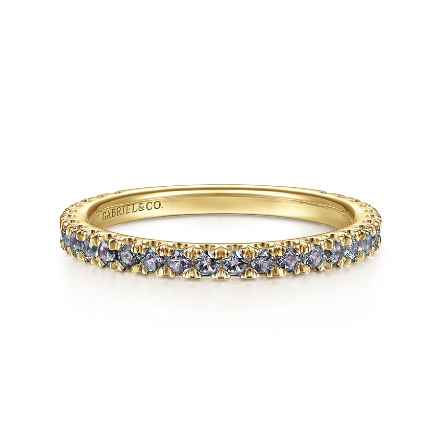 14K Yellow Gold Created Alexandrite Stackable Birthstone Ring. This classic stackable birthstone ring features .57cttw of round created alexandrite, the June birthstone, set in a split prong design. Available in every birthstone color, makes a perfect, mother's day present, push present, or guard band. Designed by Gabriel & Co.