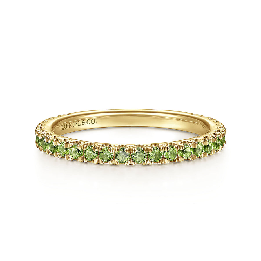 14K Yellow Gold Peridot Stackable Birthstone Ring. This classic stackable birthstone ring features .83cttw of round peridot, the August birthstone, set in a split prong design. Available in every birthstone color, makes a perfect, mother's day present, push present, or guard band. Designed by Gabriel & Co.