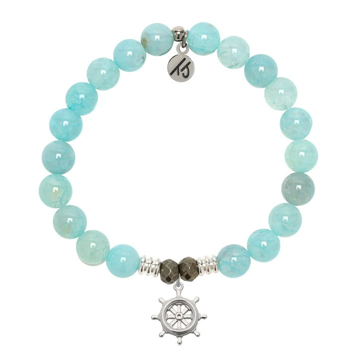 Aqua Fire Agate Stone Bracelet with Captains Wheel Sterling Silver Charm