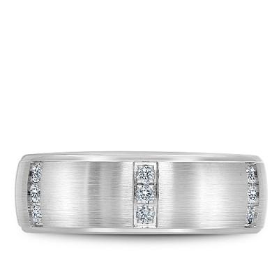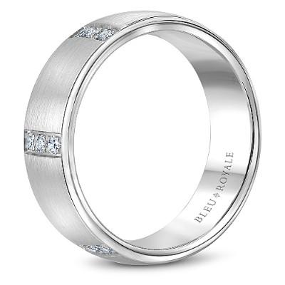 This Bleu Royale designer Men's wedding ring features a 14K white gold design measuring 7.5mm wide. Accented by 6 vertical rows of 3 round brilliant diamonds, with a color grade of G and a clarity grade of SI1, totaling .40cttw. Finish with a high polished 14K white gold interior. Finger Size 10