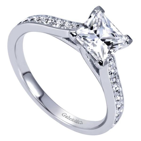 14k white gold .30cttw classic bead set princess cut diamond engagement ring. This 1/3cttw mounting features bead set round G/SI quality side diamonds, designed to simply accent a 1.25ct princess cut center diamond (measures approximately 6mm square). Designed by Gabriel & Co. #200A