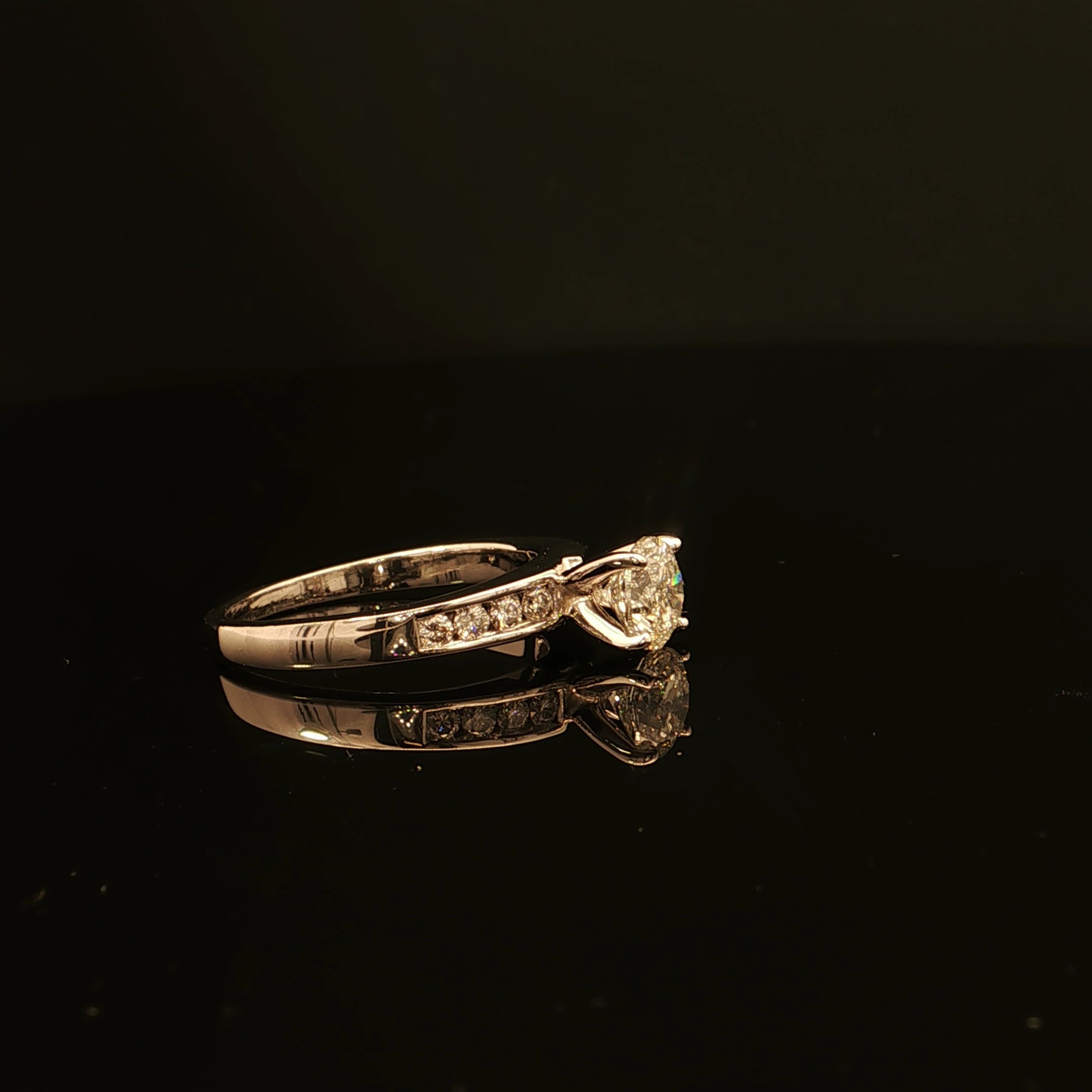 18K White Gold 1.08cttw with .83ct G/I1 Center Channel Set Round Diamond Engagement Ring. Features 8 round diamonds with G/SI quality, totaling .25cttw. Accenting a .83ct G/I1 round diamond center measuring 5.71x5.79x3.73mm. Finger Size 6.25.