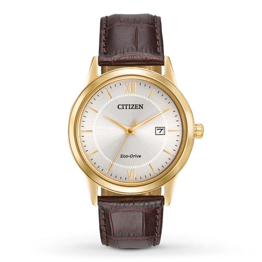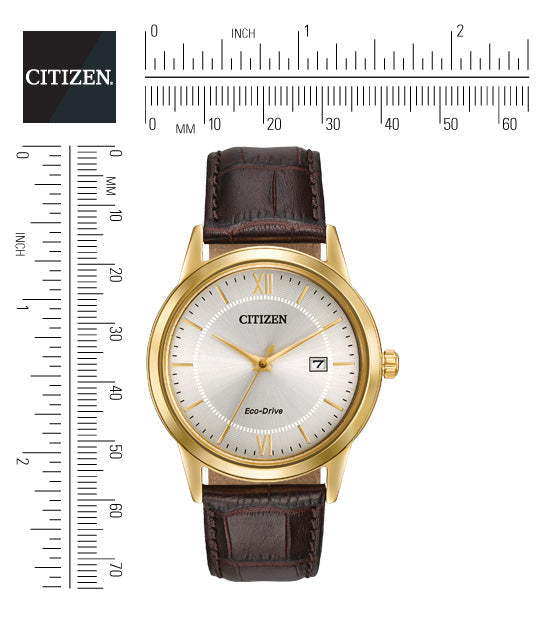 Citizen Eco-Drive Men's Corso Gold-Tone Strap Watch. This Eco-Drive watch is powered by light, and features a 40mm gold-tone stainless steel case with gold accented dial and brown leather strap. Features a mineral crystal. Citizen’s Eco-Drive technology, so it is sustainably powered by any light and will never need a battery.