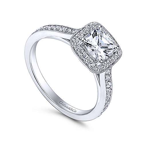 14k white gold .28cttw classic cushion halo cushion diamond engagement ring. This 1/3cttw mounting features bead set round side diamonds in a cushion halo style, designed to accent a 1ct cushion shaped center diamond (measures 5.5mm square). Designed by Gabriel & Co. #199A
