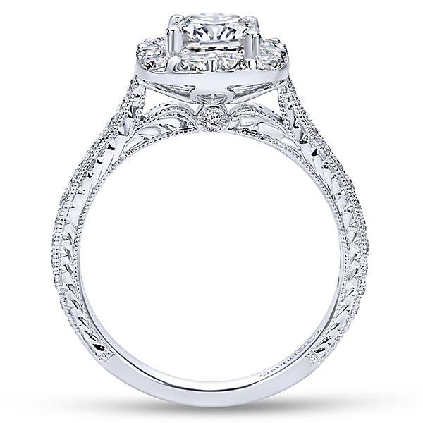 14K White Gold .71cttw Cushion Cut Halo Diamond Engagement Ring. This wonderfully simple, classic cushion style features .71cttw of round diamonds bead set in a straight shank and slightly larger than normal prong set halo design. The larger halo is designed to accent the real star of the show. A 1ct cushion cut center diamond set in a 4-prong head. All accent diamonds are F/G in color and SI in clarity. The ring is further accented by a hand engraved shank, adding a wonderfully vintage touch. Also available in yellow or rose gold, and platinum, either two-tone or single metal color by request. Designed by Gabriel & Co. #376A