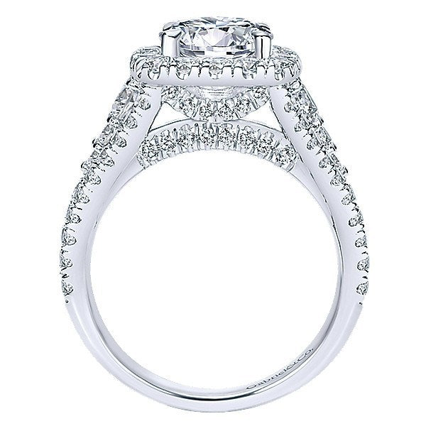 14K White Gold 1.54cttw Split Shank Diamond Engagement Ring with Cushion Halo. This stunning ring features 1.54cttw of round diamonds pave set in a split shank design with 6 tapering round diamonds split in the shank. The mounting is designed to feature a 1.5ct round center diamond surrounded by a cushion shaped halo. All diamonds are F/G in color and SI in clarity. Designed by Gabriel & Co. #335A