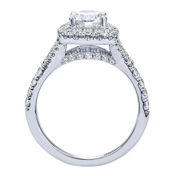 14K White Gold .77cttw Cushion Shaped Halo Diamond Engagement Ring with Subtle Split Shank. This vintage style mounting is designed to feature a 1ct round diamond that will be surrounded by a cushion shaped halo. Designed by Gabriel & Co. #306A