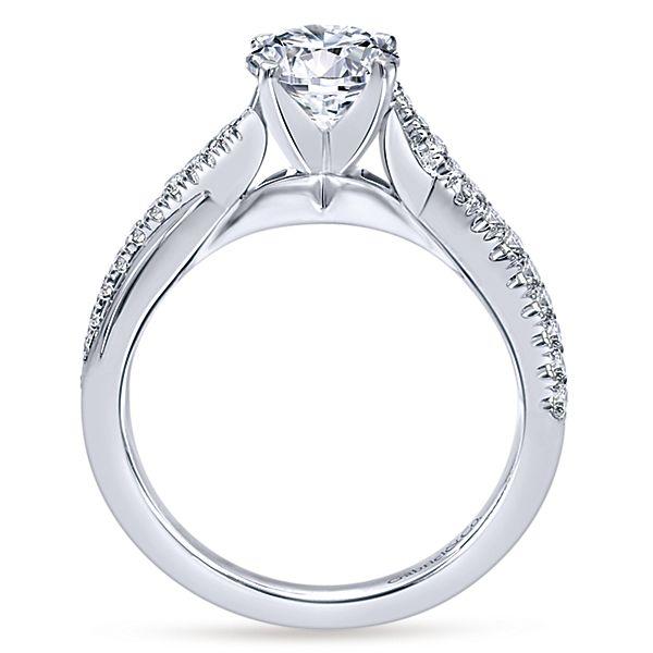 14K White Gold .19cttw Crossover Pave Round Diamond Engagement Ring. This classically sophisticated style mounting features .19cttw of round diamonds pave set in a crossover style with a polished mirrored shank. This minimalist design will wonderfully accent a 1ct round brilliant center diamond set in a 4-prong head. All accent diamonds are F/G in color and SI in clarity. Designed by Gabriel & Co. #387A