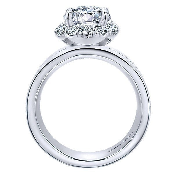 14K White Gold Wide Brushed Channel Set Diamond Engagement Ring. This ring features 1.19cttw of round channel set diamonds set in the middle of a 7mm wide band with brushed finish. Features a round diamond halo designed to accent a 1.5ct round center diamond. All diamonds are F/G in color and SI in clarity. Designed by Gabriel & Co. #330A