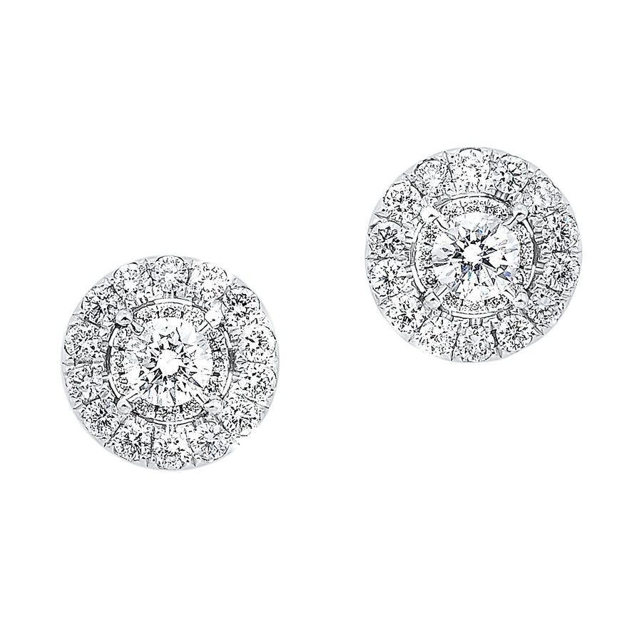 14K White Gold 1/2cttw Round Diamond Halo Cluster Stud Earrings. These .50cttw diamond stud earrings feature a cluster of G/SI quality round diamonds in a halo design with friction back posts and earnuts.