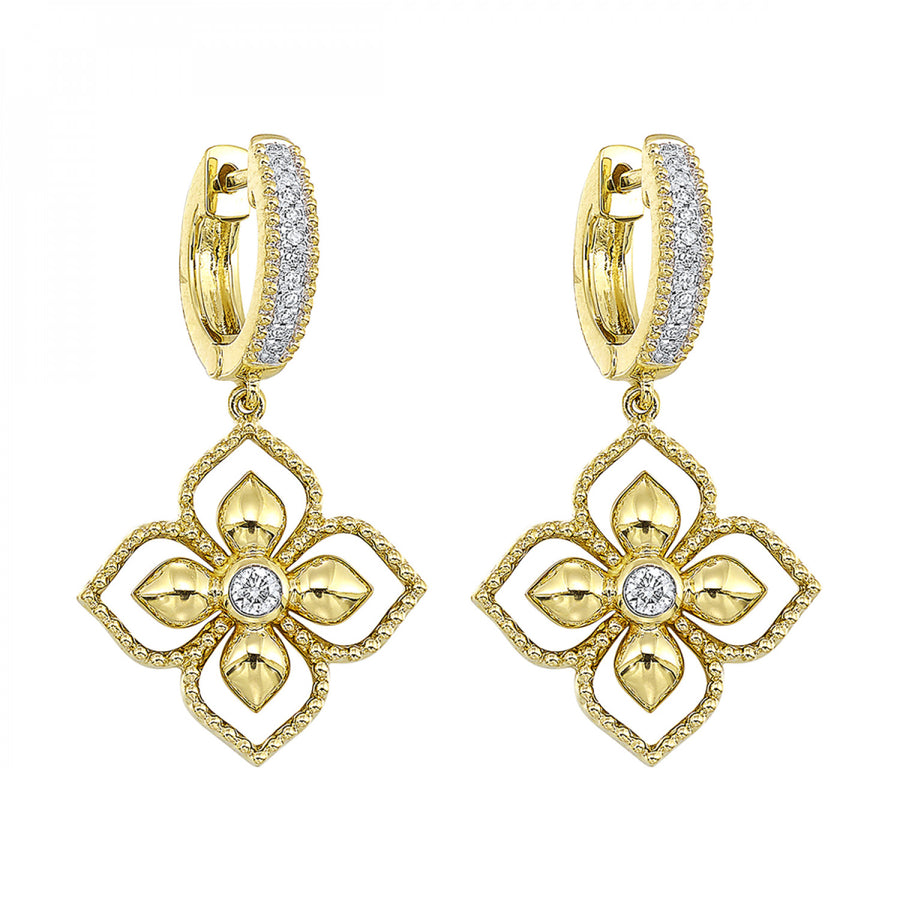 14K Yellow Gold 1/8cttw Diamond Dangle Huggie Style Earrings. These fun diamond huggie style earrings are made of high polished 14K yellow gold. Accented by pave set round diamonds totaling 1/8cttw.