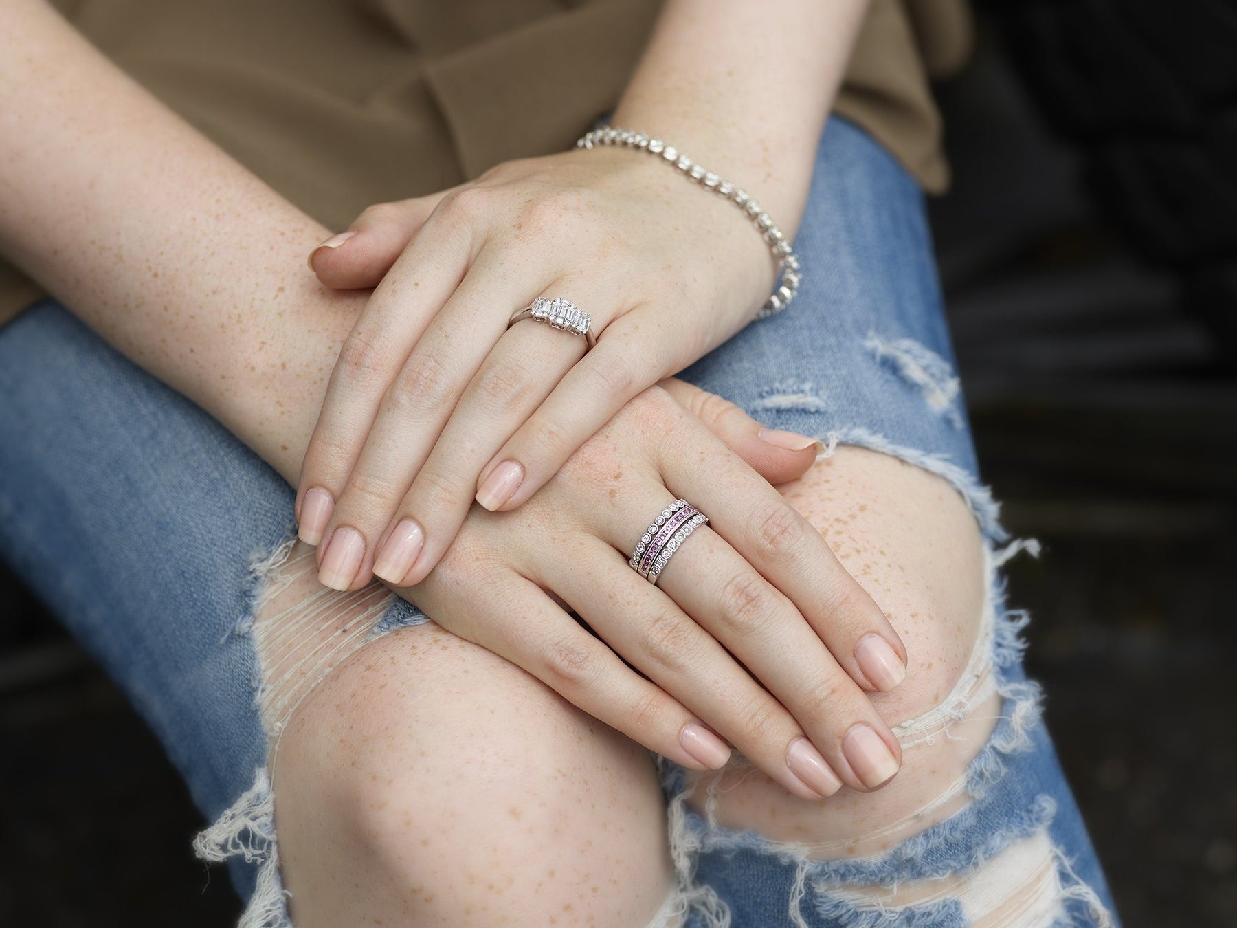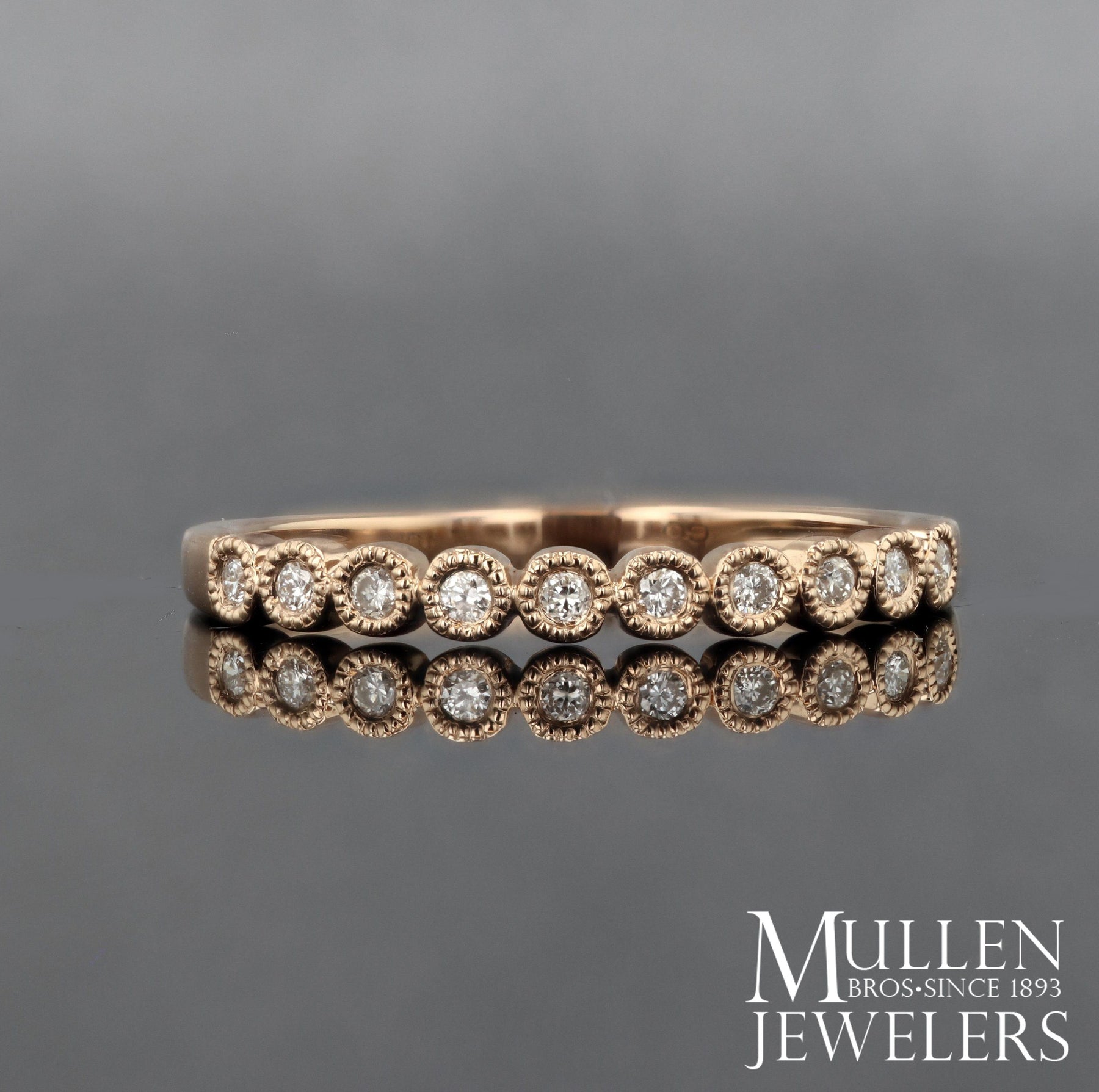 10K Rose Gold .12cttw Bead Set Round Station Diamond Stackable Ring. The perfect April birthstone ring, mothers ring, wedding band or stackable ring, this 10 karat rose gold band has a classic bead set style with round stations with .12cttw of round diamonds and polished 10K rose gold going 1/3rd around the ring. All birthstone rings and mother's rings are available in all birthstones. Looks great worn alone, or as a stackable ring. Also available in white and yellow gold.