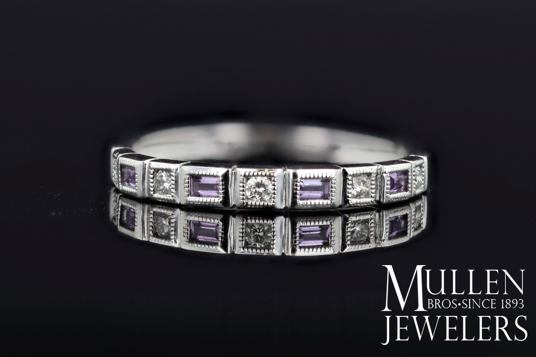 10k white gold diamond and emerald cut amethyst birthstone ring. The perfect February birthstone ring or mothers ring, this 10 karat white gold band has emerald cut amethyst and diamonds alternating half way around the ring. All birthstone rings and mother's rings are available in all birthstones, although the April (diamond) version may cost more. Looks great worn alone, or as a stackable ring.