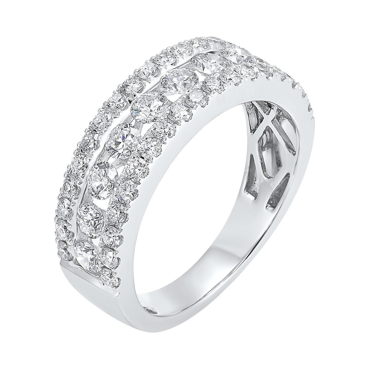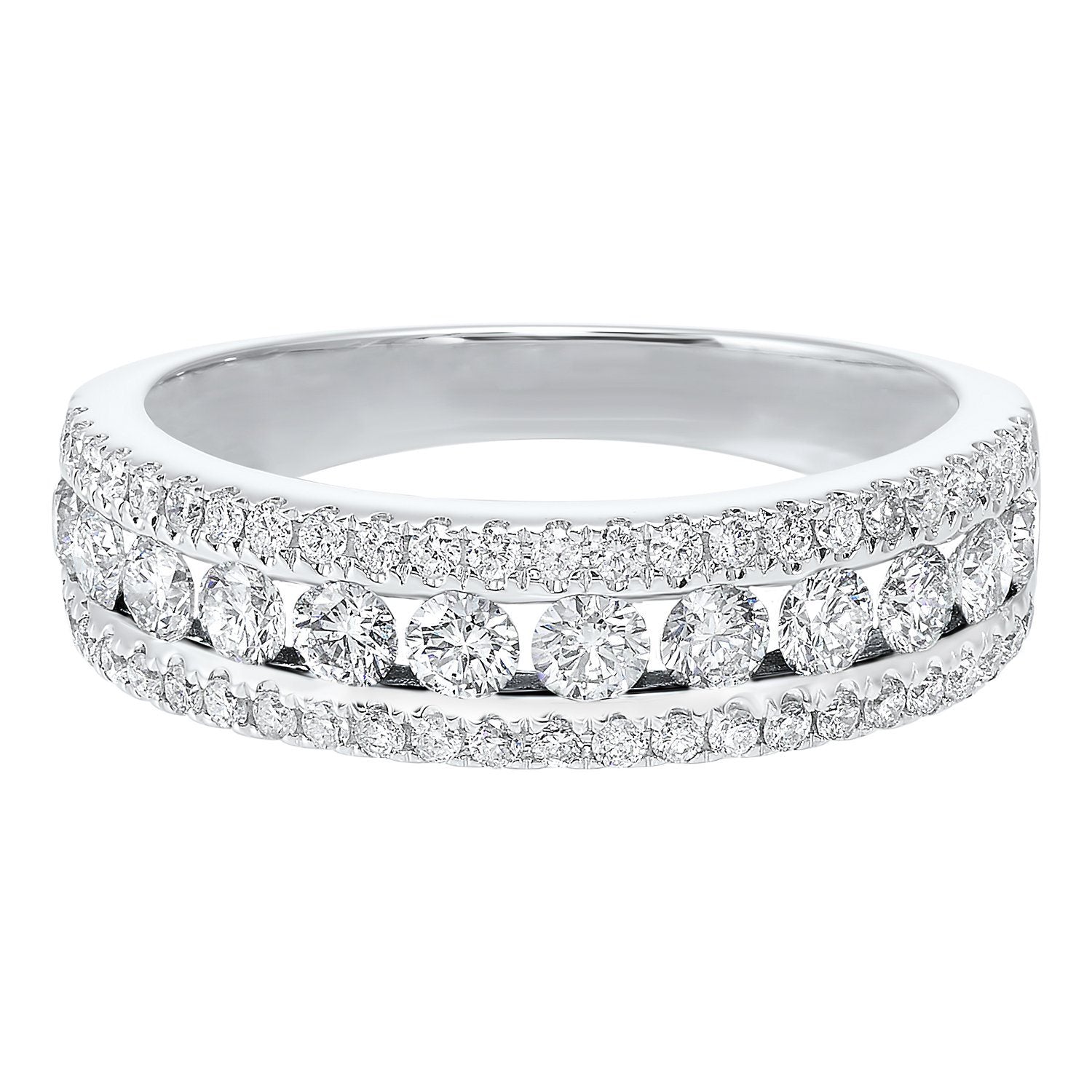 14K White Gold 1.00cttw Three Row Diamond Band. This classic 3-row diamond band features 1.00cttw of round diamonds, pave set in outer bands, with a channel set interior row. All diamonds are G in color and SI2 in clarity.