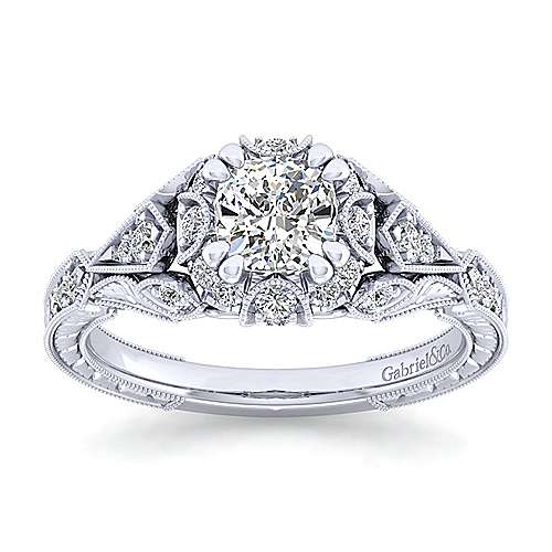 14k White Gold .34cttw Victorian Round Halo Diamond Engagement Mounting. This Annadale mounting is a Victorian style with .34cttw of round G/SI accent diamonds in the halo and on the shank that creates a dazzling look. The shank also has beautifully hand carved details on all sides of the shank finished with milgrain details that give this style it's amazing vintage look. This mounting is designed to accent a 1ct diamond of your choice. Price is for diamond mounting only, center diamond is sold separately. Designed by Gabriel & Co. #494A
