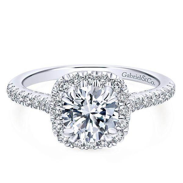 14K White Gold .60cttw Pave Cushion Shaped Halo Round Diamond Engagement Ring. Features .60cttw of accent diamonds, F/G in color and SI in clarity. This mounting is designed to feature a 1ct round center diamond. Designed by Gabriel & Co. #468A