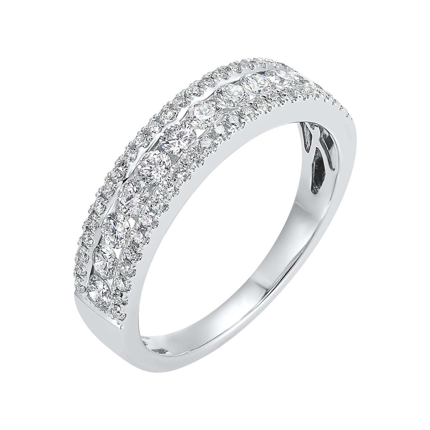 14K White Gold .75cttw Three Row Diamond Channel Band. This classic 3-row diamond band features 3/4cttw of round diamonds, pave set in outer bands, with a channel set interior row. All diamonds are G in color and SI2 in clarity.