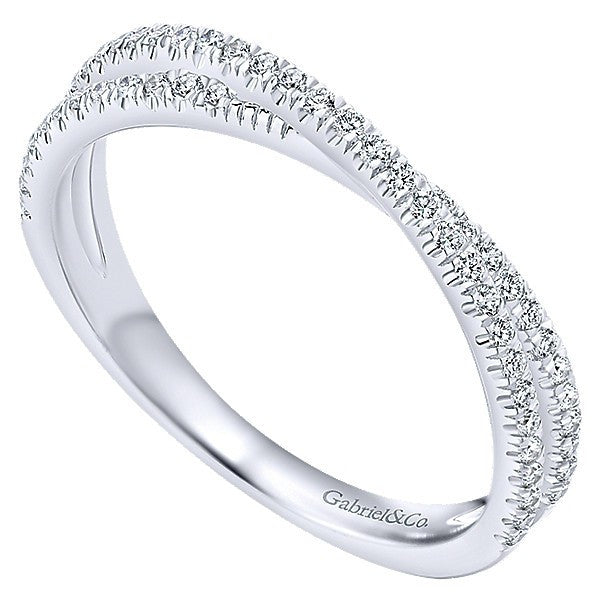 14K White Gold Diamond Crossed X Style Stackable Ring. This classic stackable band features .28cttw of round diamonds prong set with a crossover design forming an X. Diamonds average an I color and SI2 clarity. Comes in a finger size 6.5, with a polished bottom section for easy resizing. Designed by Gabriel & Co, also available in yellow and rose gold.