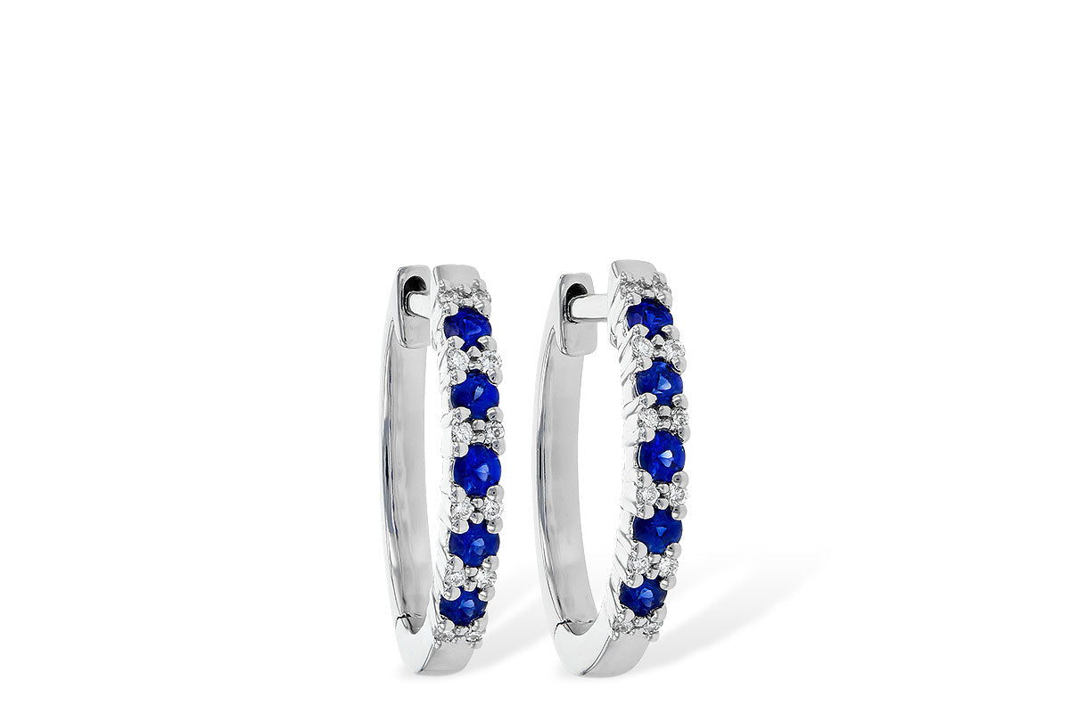 14K White Gold 1/4cttw Diamond And Sapphire Oval Huggie Earrings. These timeless hoops feature alternating round diamonds and sapphires. Features .24cttw of round sapphires and .06cttw of G/I1 quality round brilliant diamonds set in common prongs. Finished with a high polished 14K white gold and heavy notched clasp. Designed by Allison Kaufman.