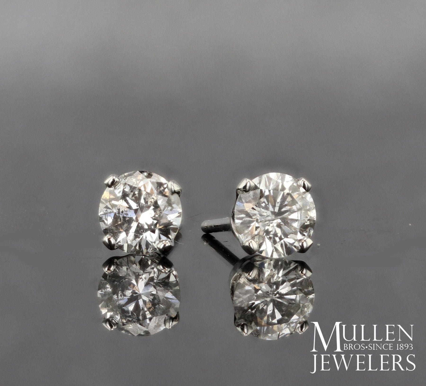 14k white gold 3/4cttw round diamond stud earrings. These diamond studs are our "good" quality and offer an exceptional value for money. These studs average a J/K color and I1 clarity and are held in sturdy 4-prong back settings, with friction back posts. Screwback posts are available for an extra charge. our 3/4cttw studs average 3/4 carat total weight and may vary slightly from .75cttw.