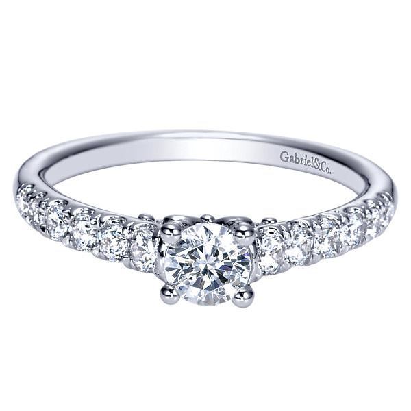 14K white gold .71cttw pave round diamond engagement ring with .36ct G/I1 center diamond. Pave set on the sides of the engagement ring are .35cttw of G/SI round diamonds. Price is for completed ring, including center diamond. Designed by Gabriel & Co., diamond wedding band sold separately. Please request finger size for this ring in the order notes, or email me. Thanks!
