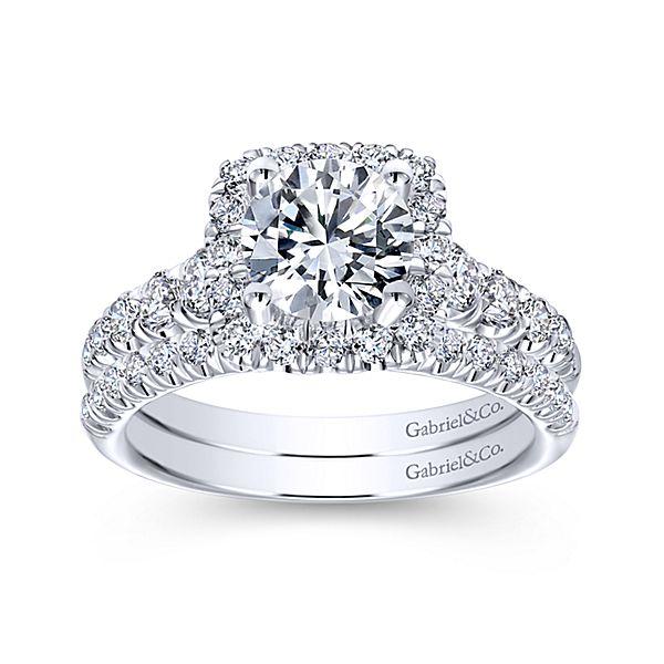 14k white gold .66cttw cushion shaped halo round diamond engagement ring. This .66cttw mounting features .66cttw of G/SI quality pave set round side diamonds. These accent diamonds are larger than most halo mountings, in a cushion shaped halo, beautifully designed to accent a 1ct round center diamond. Designed by Gabriel & Co. #210A