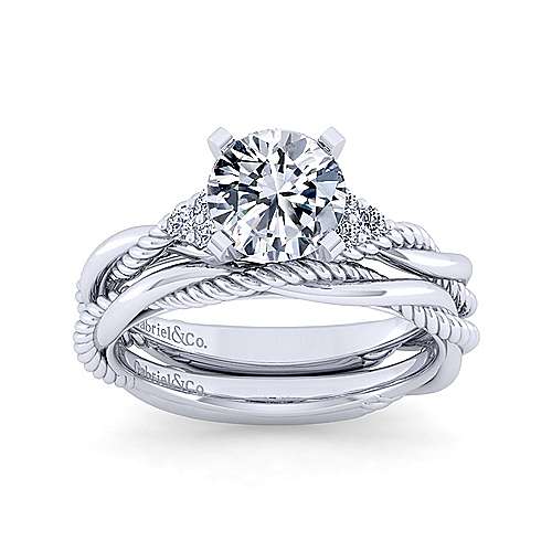 14k white gold .12cttw twisted round diamond engagement ring. This .12cttw mounting features two twisted bars of white gold, one polished and one rolled, with a cluster of round diamonds designed to accent a 3/4ct round center diamond. Many other sizes and qualities are available, just email or come in and we will customize this design to meet your needs. This unique style is designed by Gabriel & Co. #195A