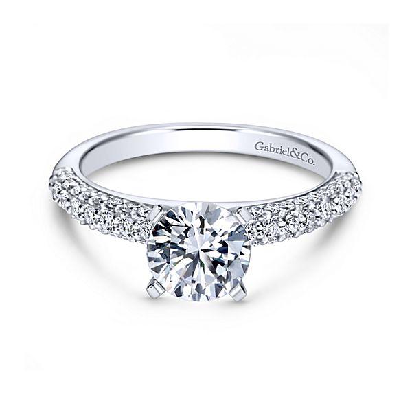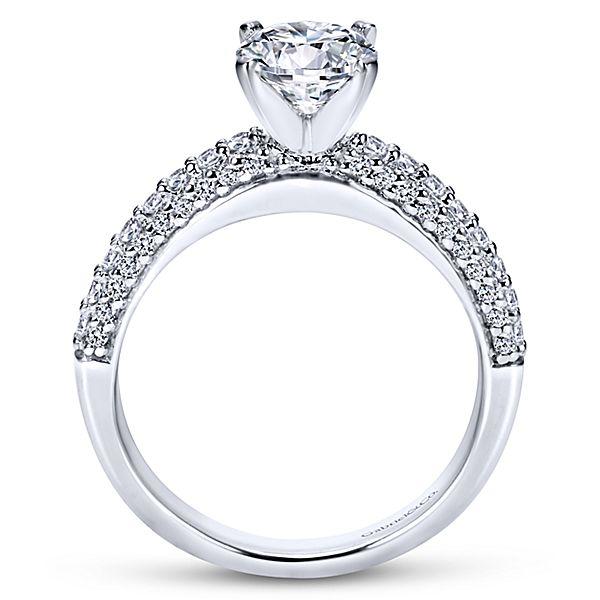 14k white gold .34cttw pave diamond engagement ring. This mounting features .34cctw of G/SI round side diamonds set with a 3-row pave style. This classic style is designed to accent a 1ct round center diamond of your choice. designed by Gabriel & Co. #33A