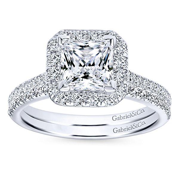 14k white gold .35cttw cushion shaped halo diamond engagement ring is designed to feature a 1ct princess cut diamond center. Petite and dainty, this cushion shaped halo mounting features .35cttw of G/SI pave set side diamonds. Designed by Gabriel & Co. #74A