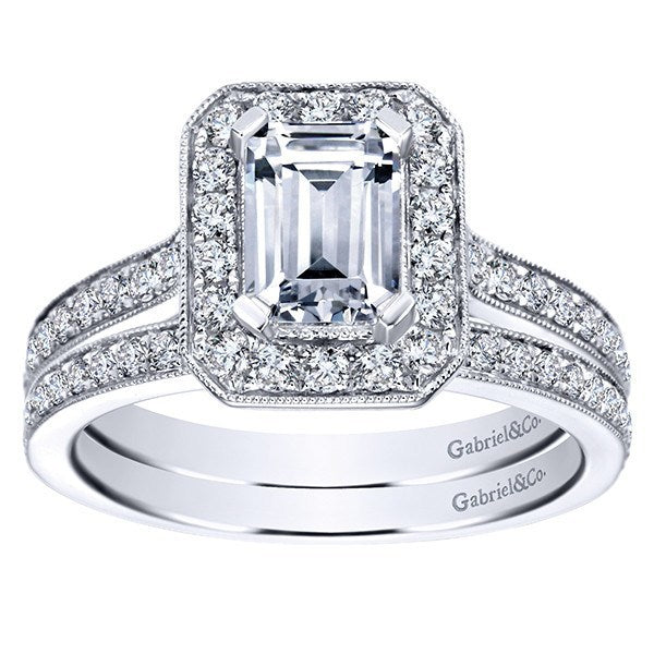 14k white gold emerald cut bead set halo diamond engagement ring. This halo diamond engagement ring mounting features .49cttw of G/SI quality bead set round diamonds running down the shank and designed to accent an emerald cut center diamond. This mounting is designed to hold a 1ct (7x5mm) emerald cut center stone, but can be modified for any size or shape center stone. Designed by Gabriel & Co. #83A
