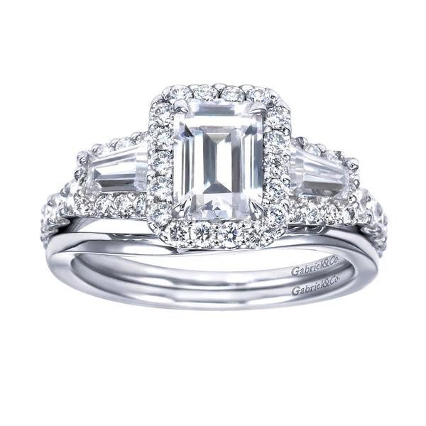 14K white gold .80cttw halo emerald cut and baguette diamond engagement ring designed to hold a 1.25ct (7x5mm) center. Features .80cttw of round side diamonds forming a halo design around an emerald cut center and two tapered baguettes. This mounting will also hold a radiant cut center diamond. Designed by Gabriel & Co. #145A