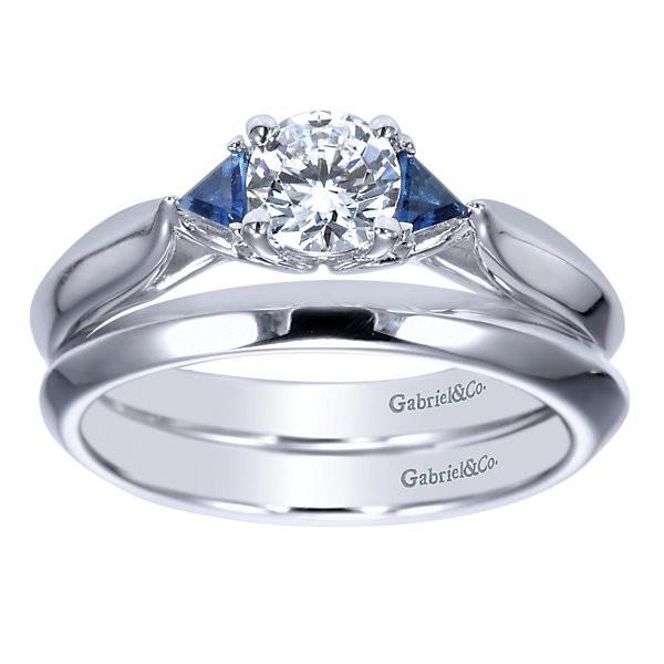 14K white gold .50ct round diamond engagement ring with trillion sapphires and J/SI3 center diamond. This twist on a classic 3-stone style engagement ring has trillion 2.6mm blue sapphires and a pinched knife edge shank accenting a .50ct J/SI3 round center diamond. Price is for complete ring, including center diamond. Designed by Gabriel & Co., wedding band sold separately. Please request finger size in order notes, or email me. Thanks!