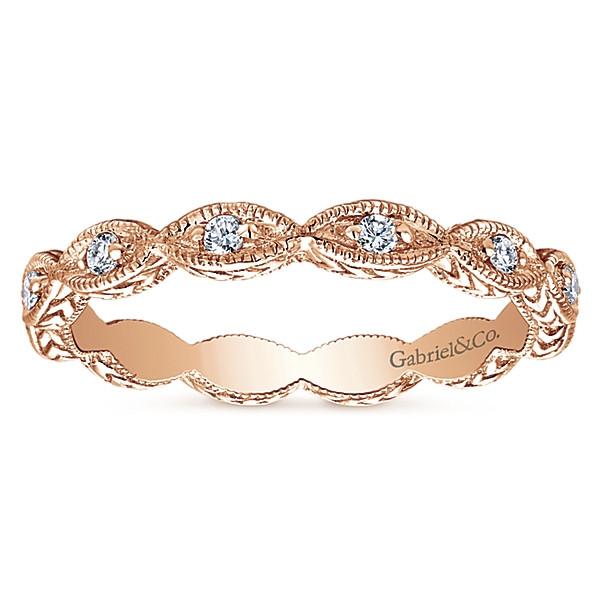 14K Rose Gold Marquise Shaped Stackkable Diamond Ring. This classic bead set diamond ring has repeating marquise shaped diamond stations bead set with .11cttw of round diamonds. Finished with an eternity style engraved side gallery, although this band is not a diamond eternity band, for easy ring sizing down the road. This ring is 14K rose gold and diamonds are I/J color and eye-clean SI3 clarity. Designed by Gabriel & Co., also available in white gold and yellow gold.