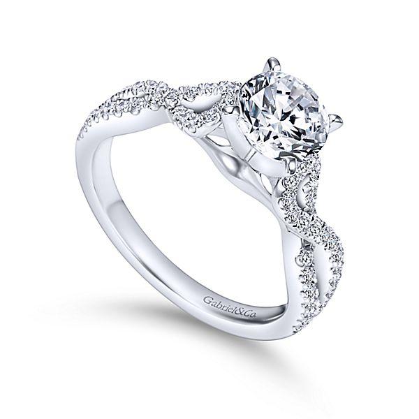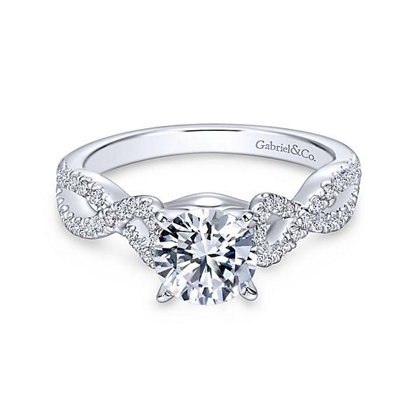14K White Gold .35cttw Crossover Round Diamond Engagement Ring. This classically sophisticated style ring features .35cttw of round diamonds pave set in a crossover style that loops over at the top. This stylish design will wonderfully accent a 1ct round brilliant center diamond set in a 4-prong head. All accent diamonds are F/G in color and SI in clarity. Also available in yellow or rose gold, and platinum, either two-tone or single metal color by request. Designed by Gabriel & Co. #388A