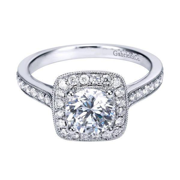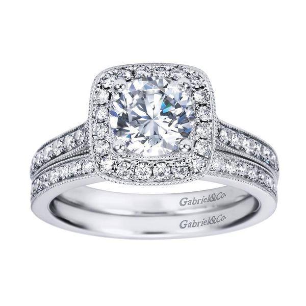 14k white gold .48cttw bead set cushion shaped halo round diamond engagement ring. This 1/2cttw mounting features bead set round diamonds with a cushion shaped halo, designed to accent a 1ct round center diamond. This sytle halo is designed to take a straight wedding band. Designed by Gabriel & Co. #187A