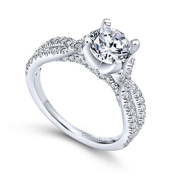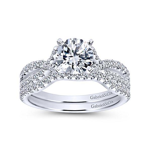 14K White Gold Crossover Diamond Engagement Ring. This classically sophisticated style ring features .54cttw of round diamonds pave set in a crossover style designed to flow into a 1ct round brilliant center diamond set in a 4-prong head. All accent diamonds are F/G in color and SI in clarity. Designed by Gabriel & Co. #390A