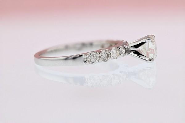 14K White Gold 1.55cttw w/ .89ct J/VS2 GIA Prong Set Round Diamond Engagement Ring. This classic style features 8 round H/SI2 quality prong set diamonds accenting a .89ct J/VS2 round brilliant diamond with GIA Cert #1358868261 and measuring 6.08x6.17x3.88mm. Finger size 7.5