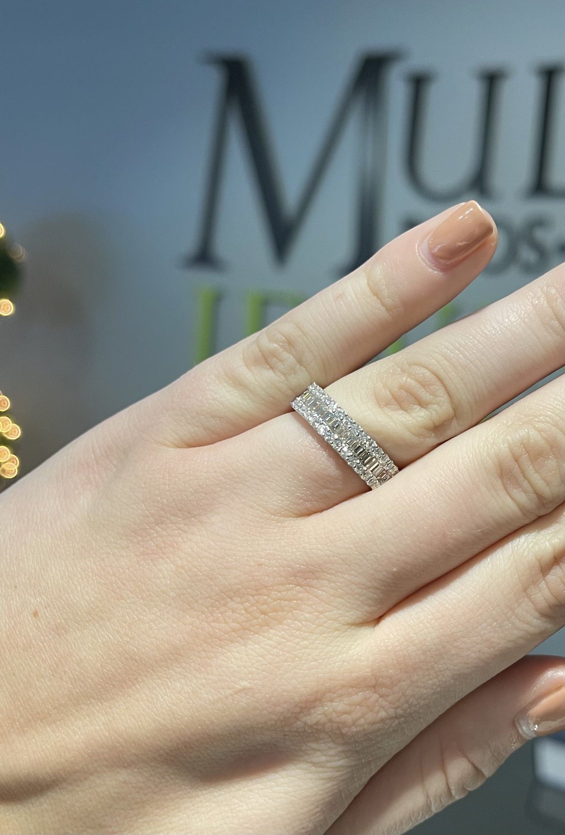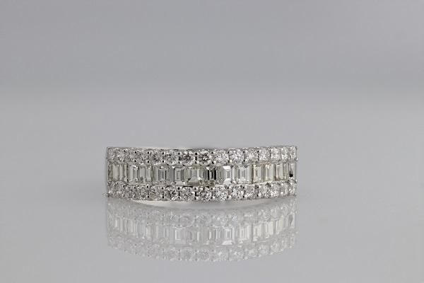 14K White Gold 1cttw Baguette and Round Diamond Band. This stylish diamond band features a center row with .57cttw of H/SI2 quality baguettes accented by 2 outer rows with .48cttw of H/SI2 quality round diamonds. All set in 14K white gold. Finger size 7.75