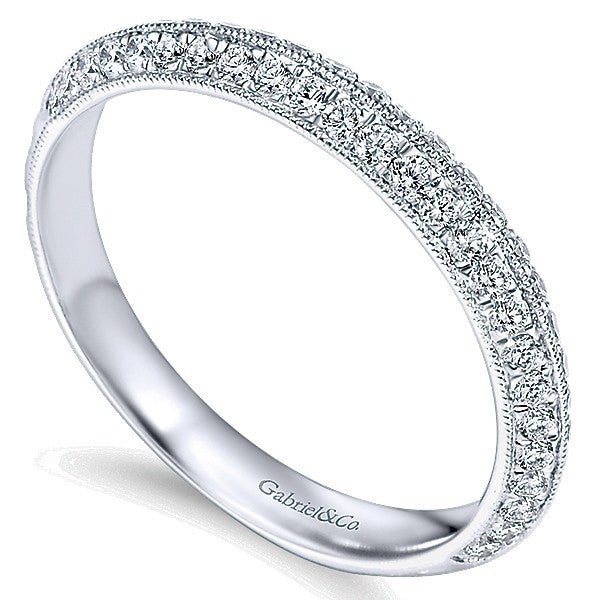 14k White Gold .34cttw Double Row Angled Diamond Wedding Band with Engraved Shank. This diamond wedding ring features .34cttw of G/SI round diamonds bead set halfway around the shank, and finished with hand engraving. Band has an angled double row of bead set diamonds with a milgrain edging. Designed to perfectly match the engagement ring #213A. Designed by Gabriel & Co. #213B