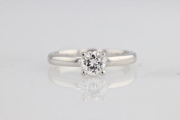 14K White Gold .53ct F/VS1 Solitaire Round Brilliant Diamond Engagement Ring. This classic solitaire features a 1/2ct round center diamond measuring 5.21x5.31x3.07mm set in a 4-prong 14K white gold setting.