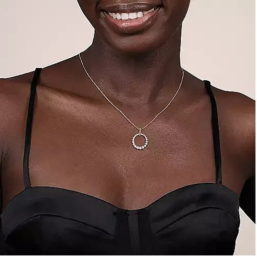 14K White & Yellow Gold .52cttw Diamond Bujukan 20mm Drop Necklace on 17.5 Inch Chain. This necklace is 14K yellow gold and diamonds are I/J color and eye-clean SI3 clarity. Designed by Gabriel & Co.